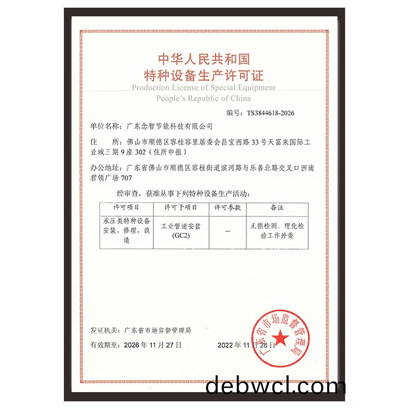 2022年11月,榮獲(huo)特種(zhong)設(she)備(bei)生產(chǎn)(chan)許(xu)可證。
